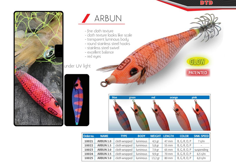 Άριστες ποιοτικά οι καλαμαριέρες της Κροατικής εταιρίας DTD σχεδιάζονται και δοκιμάζονται για τα νερά της Μεσογείου. Η σειρά Arbun έχει σχεδιαστεί για να έχει χρωματισμούς μικρών ψαριών.